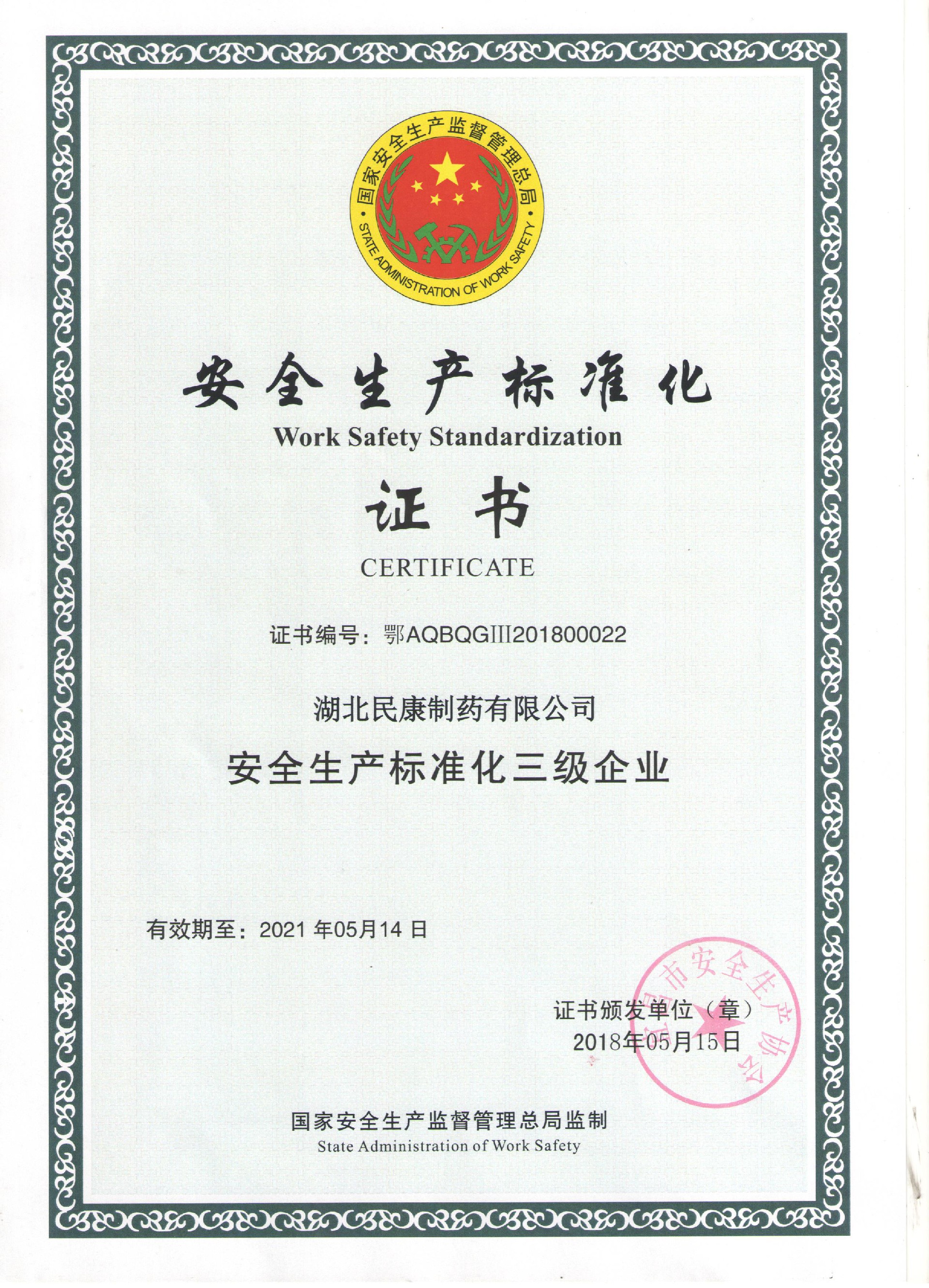 公司被國家安全生產(chǎn)監(jiān)督管理總局認定為“安全生產(chǎn)標準化三級企業(yè)”。